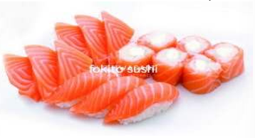 Servis avec soupe et salade; 6 sashimi saumon, 6 saumon roll cheese, 4 sushi saumon cheese