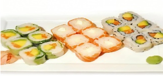 Servis avec soupe et salade; 6 saumon roll cheese, 6 california saumon avocat, 6 printemps saumon avocat